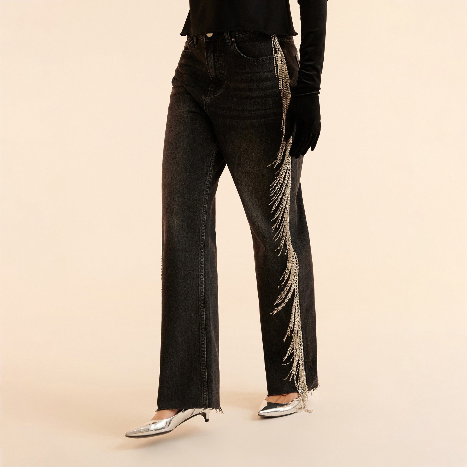 Este par de jeans con diseño de flecos de diamantes de imitación en el lateral es definitivamente el foco de la moda callejera.